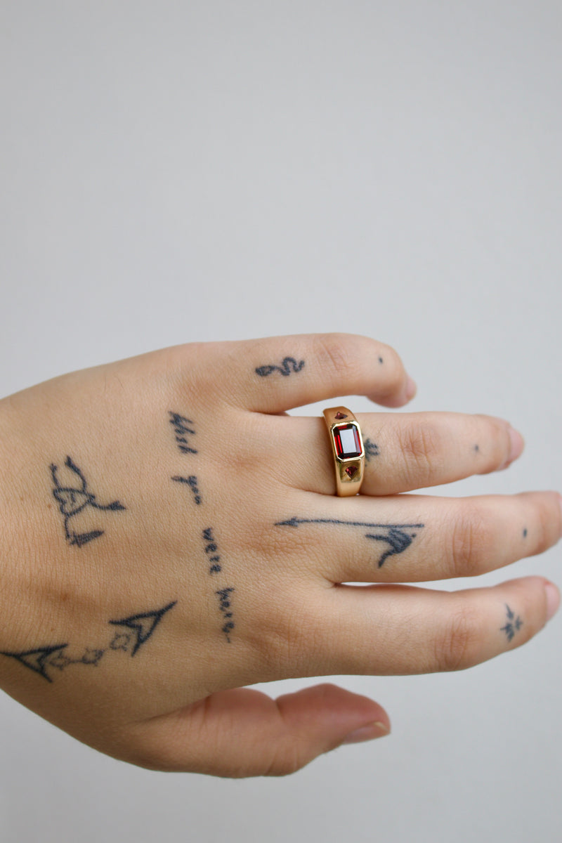 Antique cushion cut London Blue Topaz and Rhodolite Garnet ring