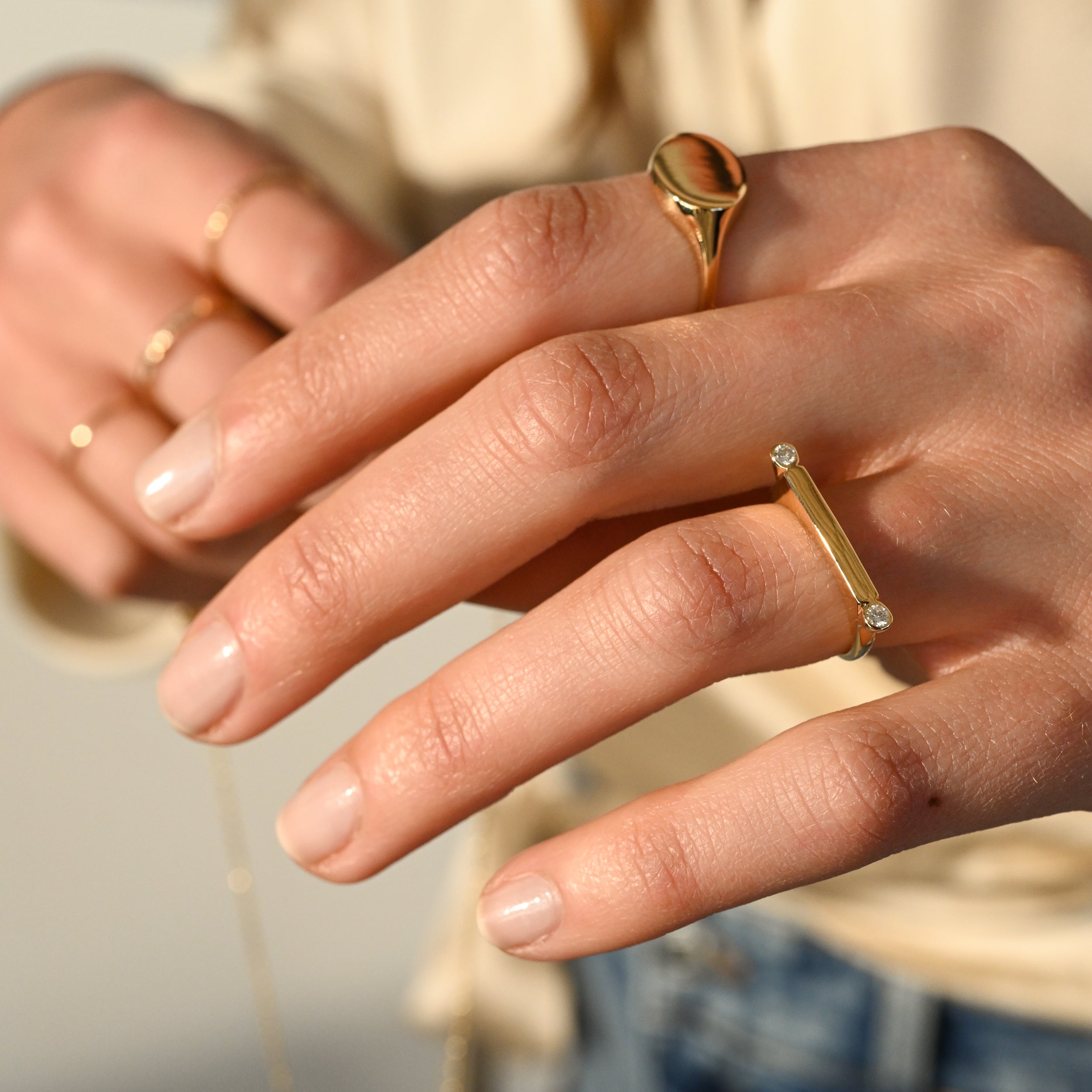 With just enough room for engraving across the top of the bar, this modern design is bound to bring new dimension to your ring stack.