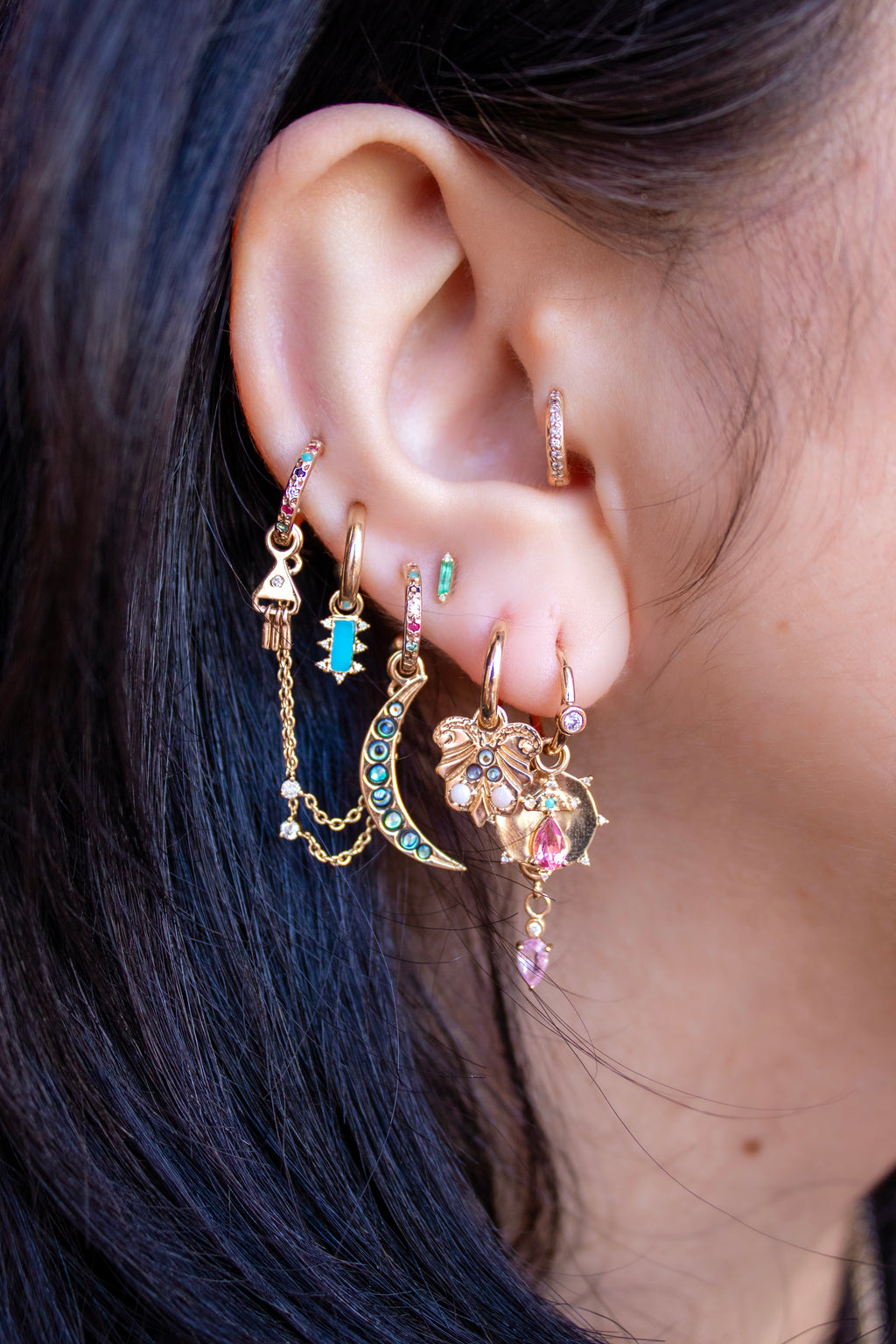 The Mini Lantern Charm is crafted in solid 10k Yellow Gold and adorned with Abalone cabochons and Australian opals. This piece symbolizes Transformation. Designed to fit perfectly with any of our classic huggies or hinge hoops. Make it a pendant by adding it to your favorite chain, using our charm enhancer for a unique look.