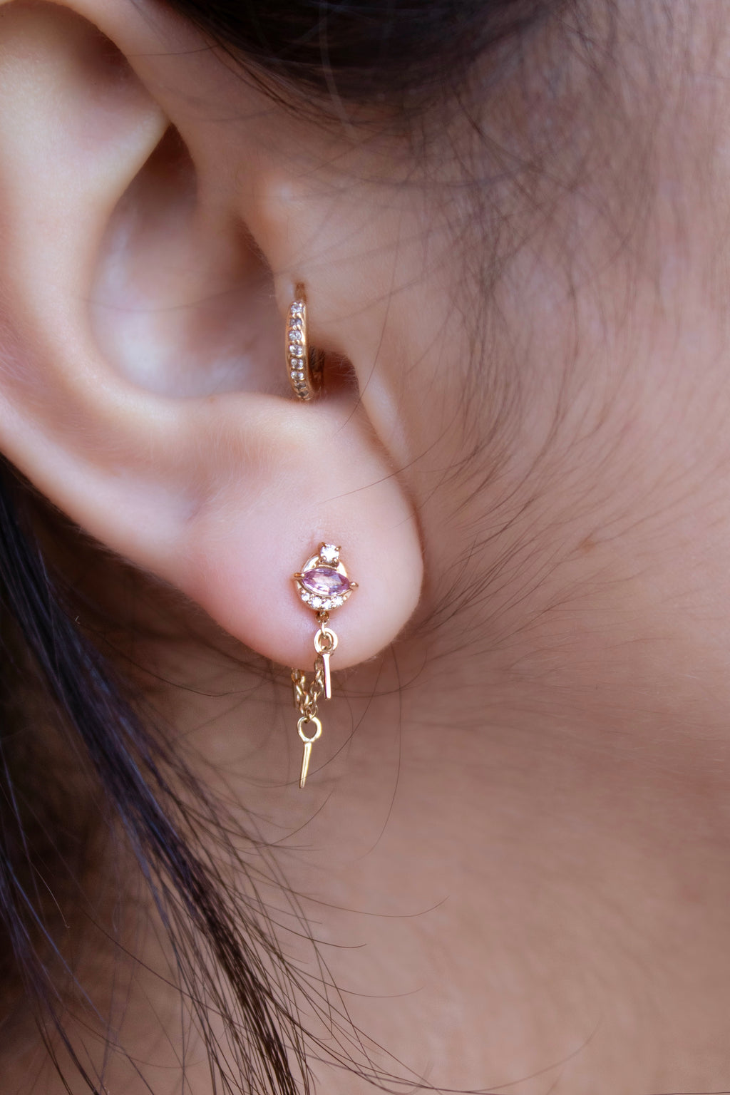 The Tinsel Swag Ear Charm is a perfect addition to your ear curation. A double chain swag design linked with three gold tinsel bars is meant to nestle behind two stud ear piercings. The draped effect adds intrigue and movement to any earrings.